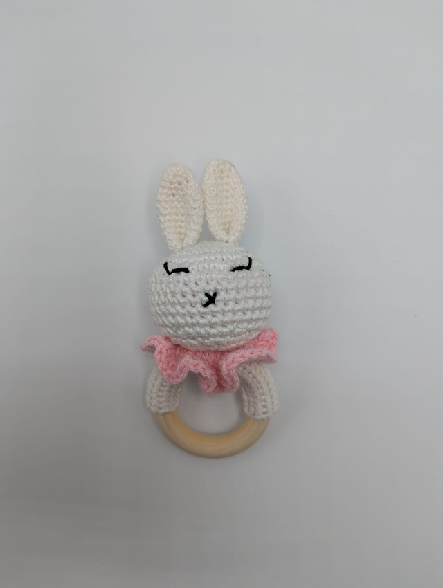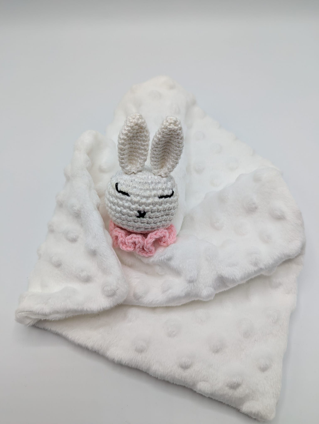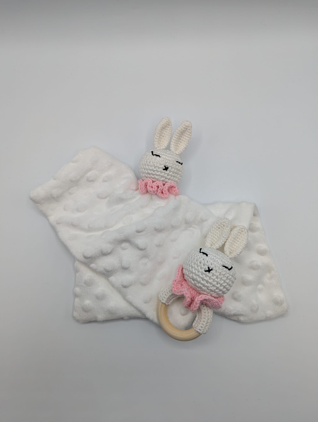 Le doudou est conçu pour être facilement manipulé par les petites mains, tandis que l’anneau de dentition, orné d’un adorable lapin crocheté, aide à soulager les gencives pendant la période de poussée dentaire.