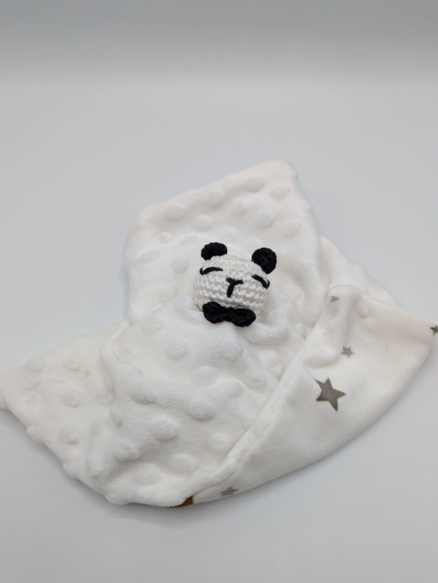 Craquez pour ce tendre ensemble bébé crocheté, composé d’un doudou et d’un anneau de dentition assorti, entièrement réalisés à la main avec soin.
