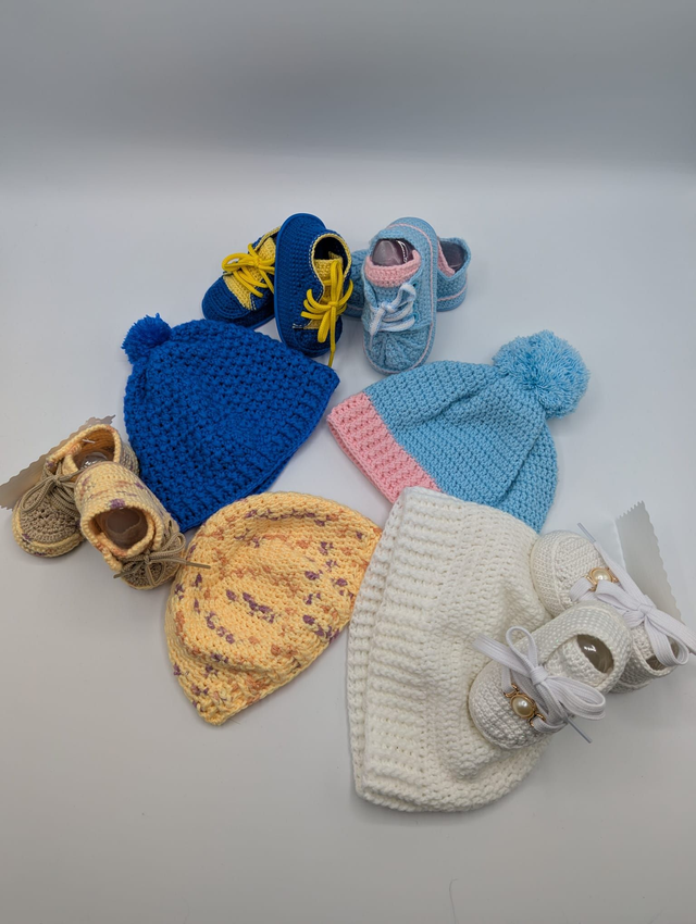 Les photos présentées montrent différents modèles d’ensembles bébé crochetés, composés d’un bonnet et d’une paire de chaussons, tous entièrement faits main avec soin et passion.