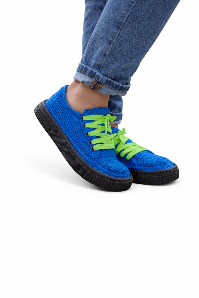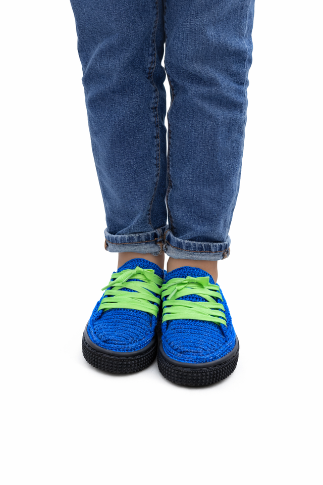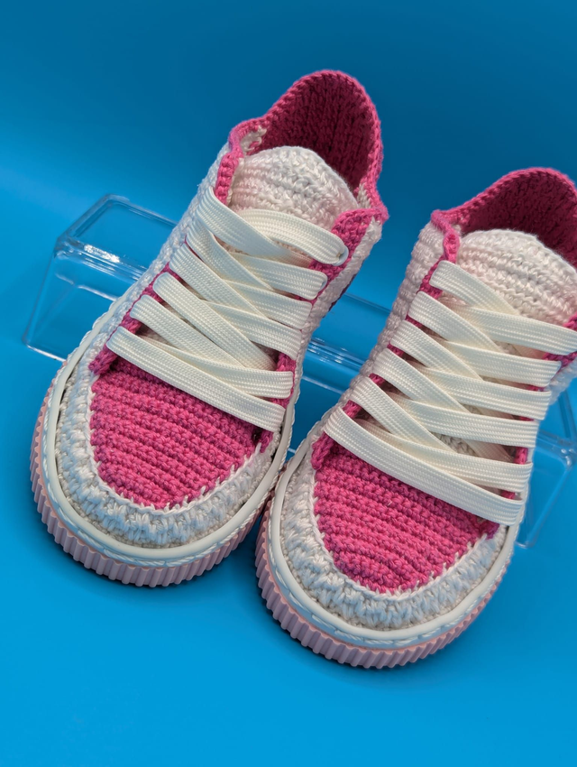 Le dessus est crocheté à la main, offrant une excellente respirabilité et une grande souplesse, idéale pour les pieds en croissance. Les lacets colorés ajoutent une touche ludique et moderne, tandis que la semelle résistante assure stabilité et sécurité lors des déplacements.